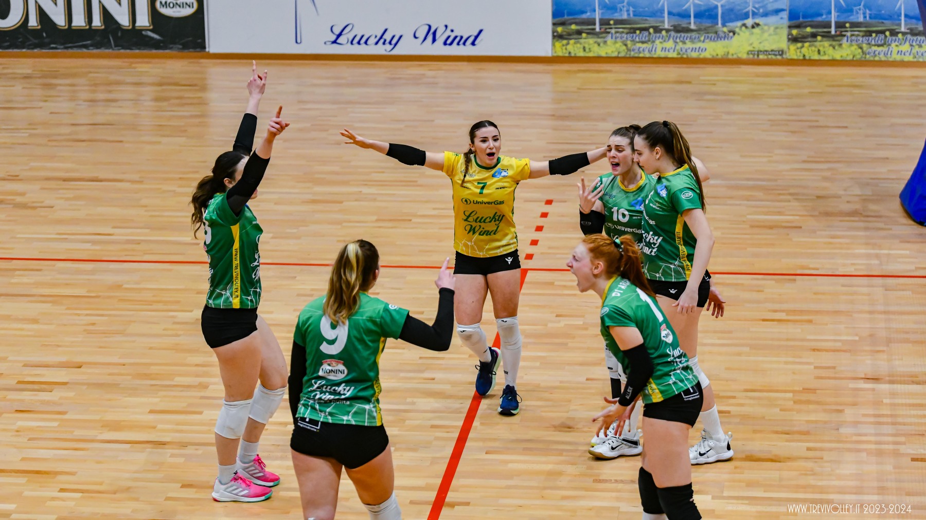 Un errore dai nove metri e un attacco sbagliato in parallela delle romane mandano le padrone si casa a più cinque (8-3). Un altro errore ospite mantiene inalterato il vantaggio della Lucky Wind, mentre Casal De’ Pazzi ferma nuovamente il gioco (13-8). Una gran difesa di Corradetti e il conseguente mani fuori di Casareale portano al massimo vantaggio trevano (16-10), che aumenta ancora complice una Volleyrò davvero molto fallosa (19-12). Due errori consecutivi delle biancoazzurre danno modo alle ospiti di accorciare e Mister Camiolo spende il primo time out (19-15). Non da gli effetti sperati, perchè la Lucky Wind continua ad essere fallosa e le ospiti tornano prepotentemente in partita e grazie ad un totale blackout delle padrone di casa passano a condurre (21-23). Reagiscono da squadra le trevane, riuscendo a portare il set ai vantaggi (24-24), ma un errore da posto 4 manda la Volleyrò avanti uno a zero (26-28). Il secondo parziale inizia all’insegna dell’equilibrio con le romane a chiamare e la Lucky Wind a rispondere (4-4). Corradetti da posto 4 e un errore ospite dalla medesima posizione smuovono il set e la panchina ospite ferma il gioco per la prima volta (8-5). Così come nella prima parte del primo parziale sono le trevane a comandare il gioco (12-8).