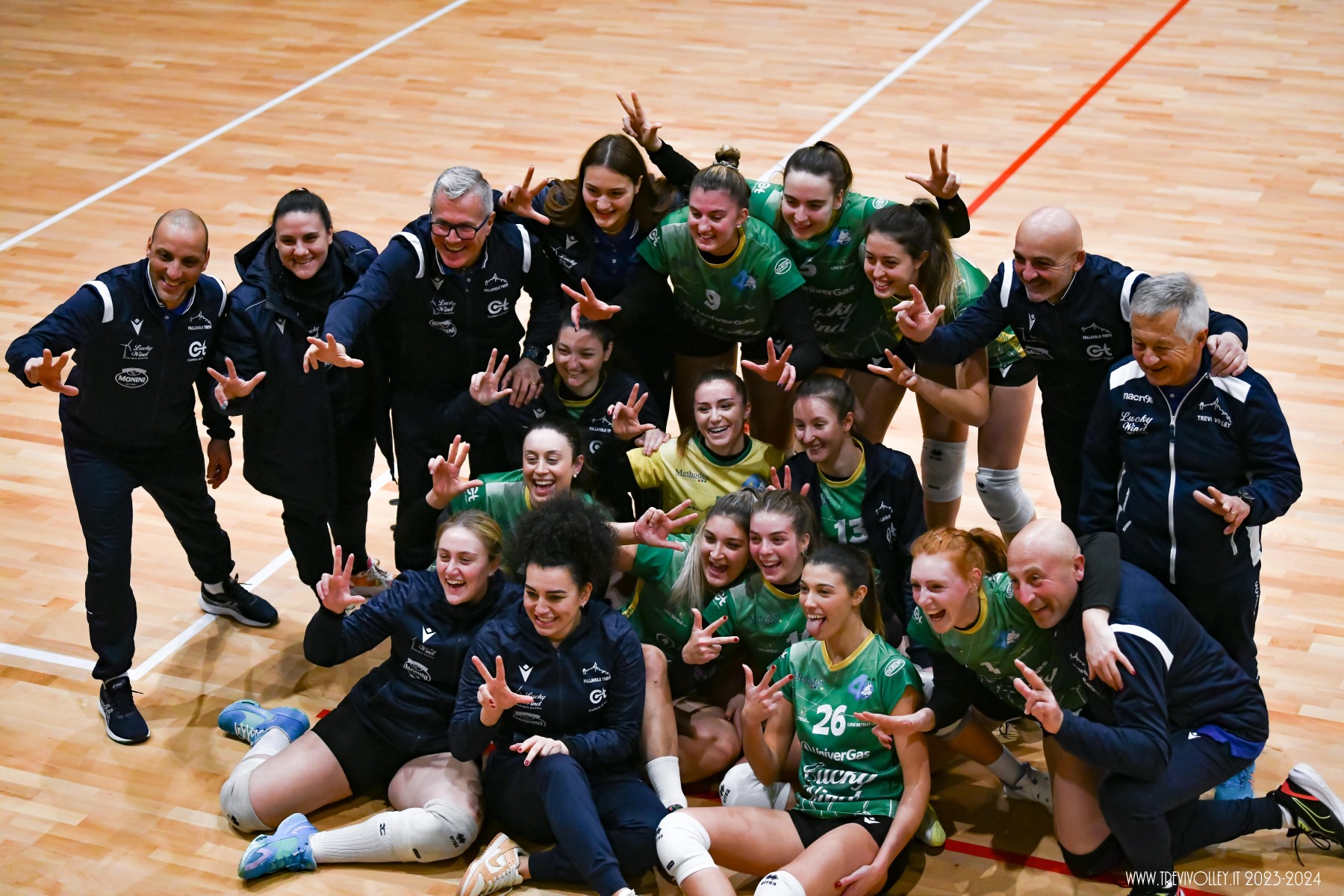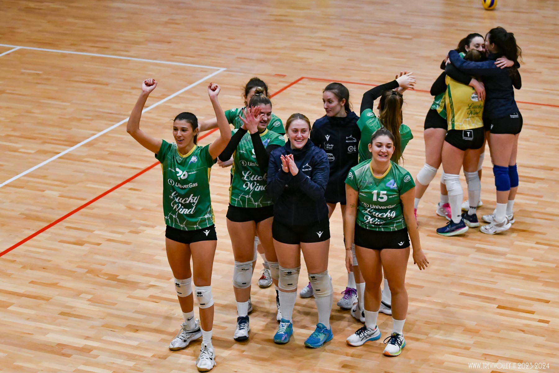 È ancora notte fonda per le ospiti, che non riescono a reggere l’onda d’urto trevana che raggiungono il punto del due a zero con una facilità disarmante, quasi fossero loro le prime della classe (25-22). Il terzo set, così come il primo, si sviluppa con un sostanziale equilibrio fino a metà periodo (16-14), poi è nuovamente un’indiavolata Lucky Wind, quasi perfetta anche in difesa e a muro e Castelfranco che inizia ad essere stanca e fallosa anche dalla linea dei nove metri, ad allungare nuovamente e a costringere la panchina ospite a fermare il gioco per due volte a stretto giro di giostra (21-17). È solamente il preludio ad un trionfo (perché si, si tratta di un trionfo a cui pochi addetti ai lavori avevano pronosticato) che smuoverà anche la classifica (25-19). Una vittoria, come già si diceva, che in pochi avevano pronosticato (chi scrive si prende la paternità di dire che ne aveva quasi la certezza) e che sicuramente darà alcune consapevolezze in più ad una squadra che, se solo qualche giorno fa si ipotizzava che potesse competere con tutte, tranne le prime della classe, dopo questa prestazione si può assolutamente dire che può competere con tutte, era solo questione di tempo.