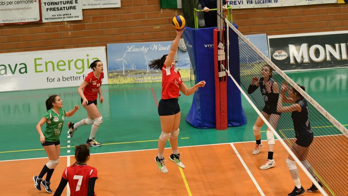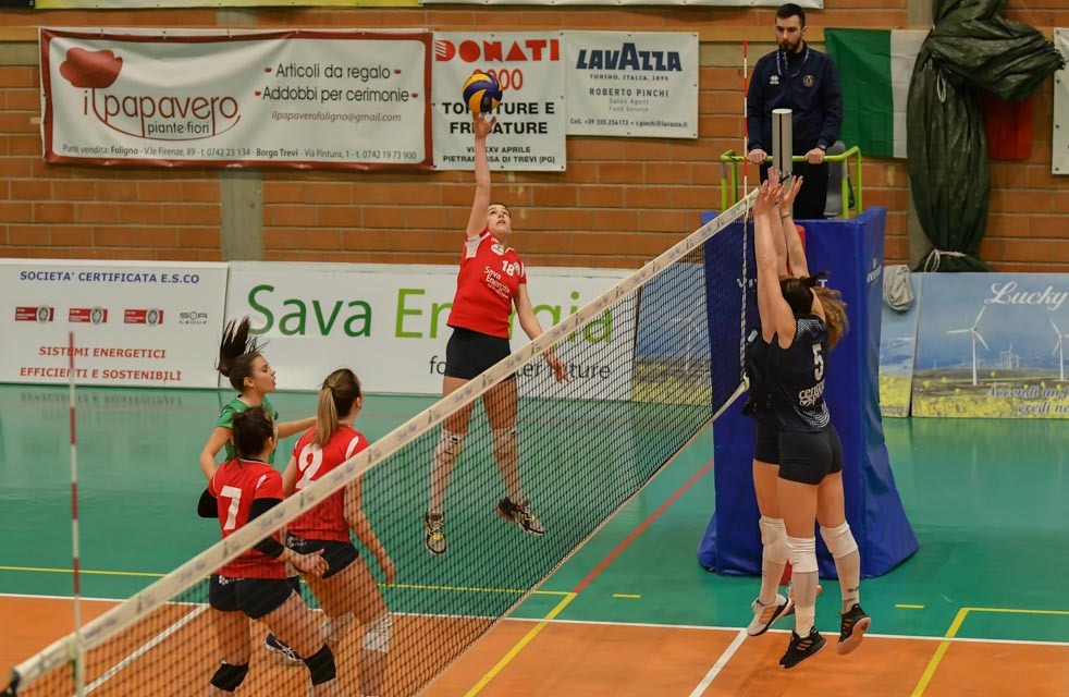 Nella prima partita della seconda fase del campionato Under 18 girone Gold, la Sava Energia Trevi continua la sua striscia vincente di vittorie. A cadere sotto le grinfie delle umbri sono state le ragazze della Pallavolo Gubbio per 3 a 0. Nonostante i parziali netti (12-12- 18), la partita è stata gradevole da vedere con buone giocate fatte da entrambe le compagini. Tra le padrone di casa, si evidenzia le prestazioni di Pizzi13 punti a referto, oramai pienamente recuperata dall’infortunio, Ndulue con 12 punti ed Eleuteri con 11, di cui 5 a muro. Tra le ospiti, si segnalano le prestazioni della schiacciatrice Nicchi e della centrale Fumanti. Nel primo set, le due squadre si mantengono in parità fino al 7 pari, quando con il servizio ficcante di Rachele Pioli, la Sava Energia mette a segno un parziale di 7 punti a 0 (14-7). La squadra di casa inizia a macinare gioco e punti e con un punto di Ndulue fissa il parziale sul 25-12. Se nel primo set era stato il servizio di Pioli ad incidere sul parziale, nel secondo set è il turno iniziale di Elisa Bosi ad incidere con il suo servizio facendo segnare un parziale di 6 a 0. Il set rapidamente prende la direzione di Trevi e, sfruttando il turno al servizio di Pioli, il parziale finisce come il primo (25- 12). Il terzo set, inizia in condizione di equilibrio fino al 7 a 7, quando la Sava Energia dà lo strappo decisivo alla partita portandosi sul 14-7. Distanza che si mantiene inalterata fino al termine del match, che si conclude sul 25-18. La Sava Energia è attesa ora dall’impegno in trasferta a Città di Castello giovedì 31 alle ore 16:30; Pallavolo Gubbio affronterà in casa Pallavolo Perugia Rubino lunedì 28 alle 17:30.